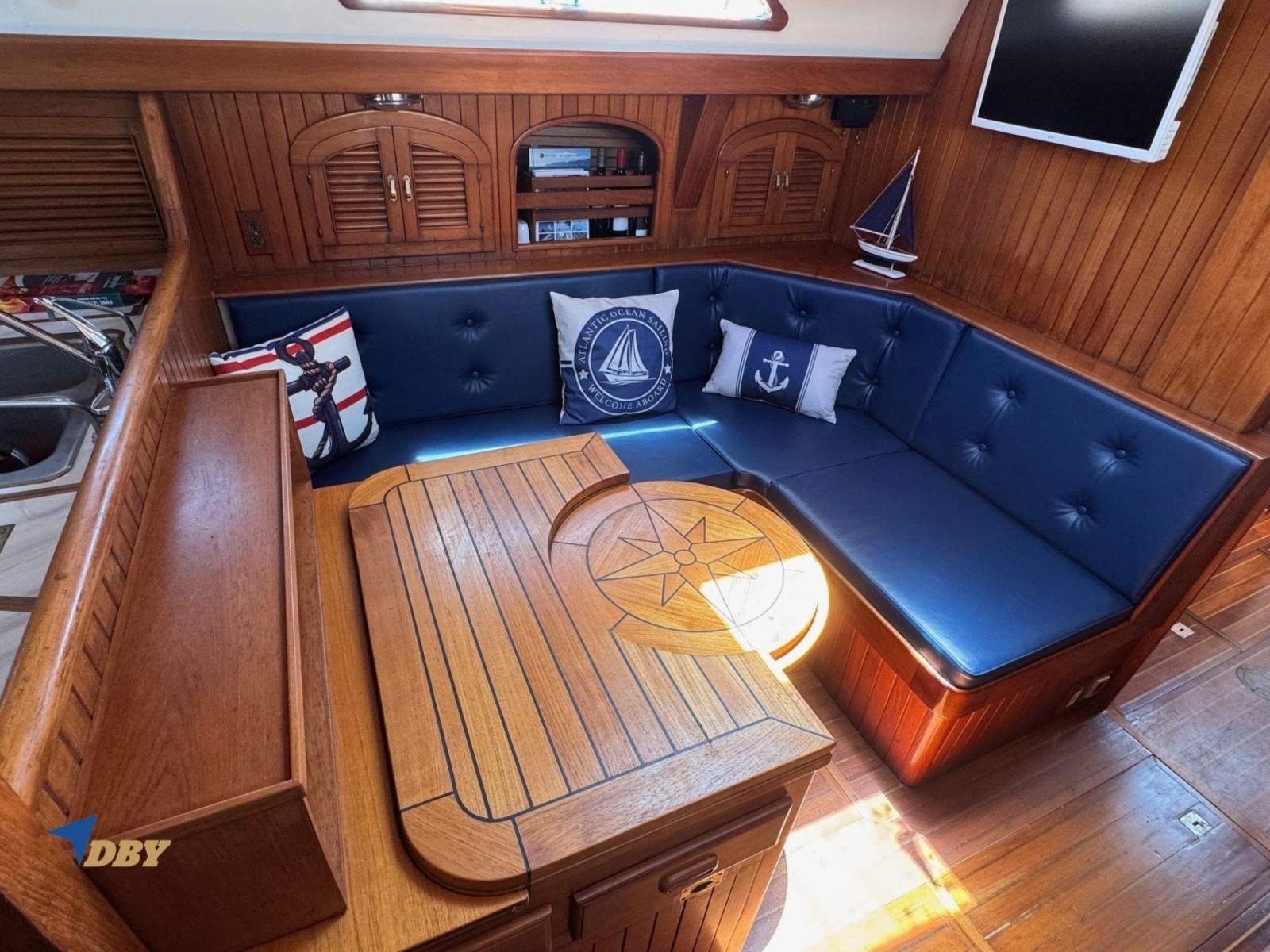 Galley Notes : New bench top in galley. New seat upholstery/coverings in all seating in dinette area. New teak dining table (imported from the UK) to replace very heavy original folding table.
