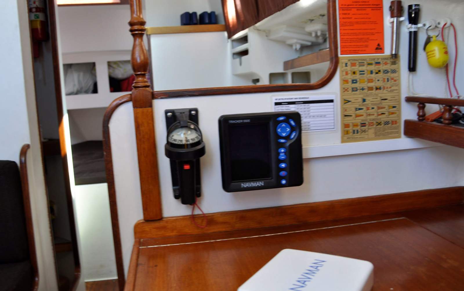 Depth gauge, wind and direction indicator and speed indicator. NAVMAN 5505 Chartplotter. GPS antennas. ST1000 Tiller pilot