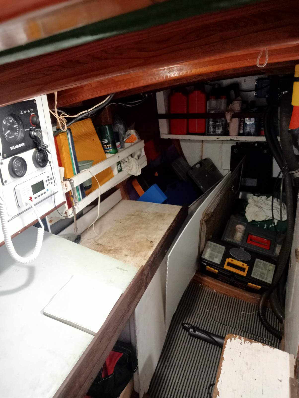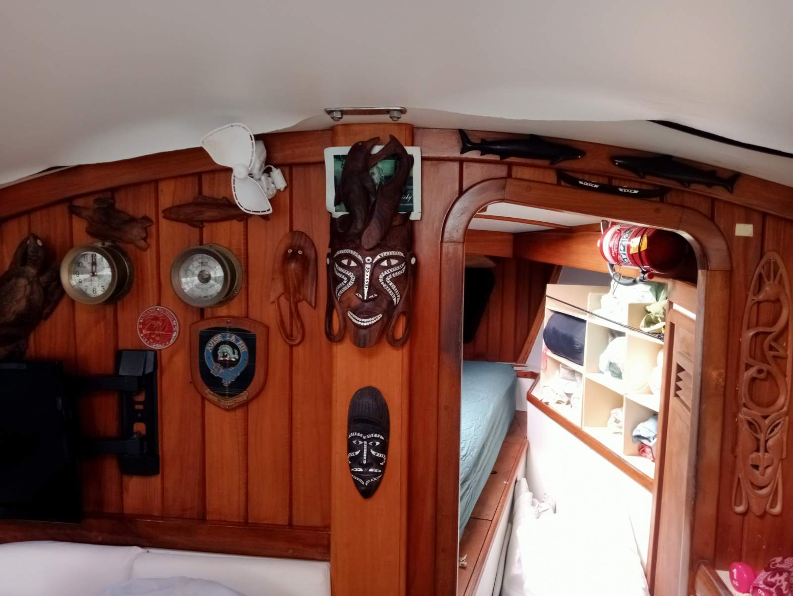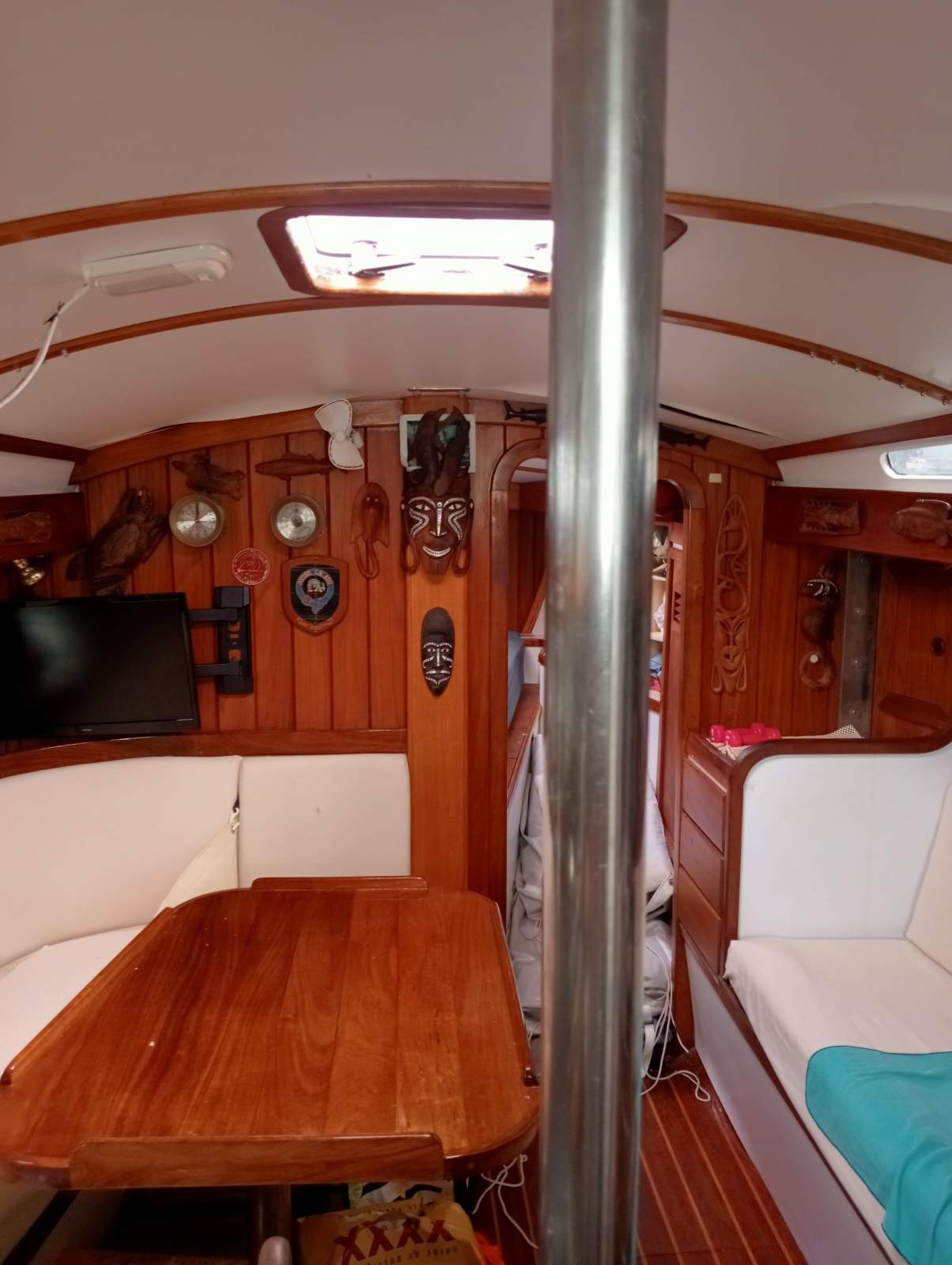 Forward berth. Saloon, dining galley, quater berth. Storage, workshop nav table area. Sbeing only 10.6 loa, she is more an open area type of fitout