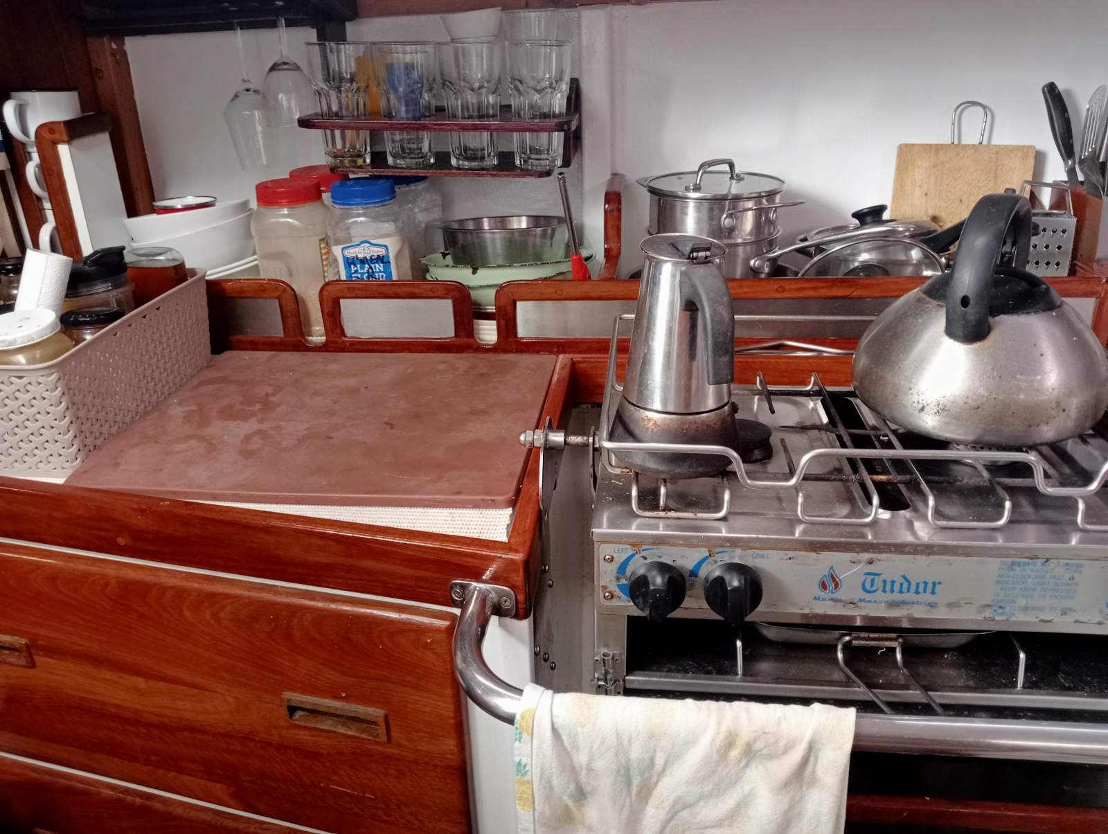 Reasonable size galley with 2xlarge prep benches. Stainless steel tops. Large toploading 12volt danfoss electric frig. Large storage draws and lundersink cupboard. Secure storage for plates, pots, cups, cutlery etc. F2 burner Broadwater stove, griller and oven.
