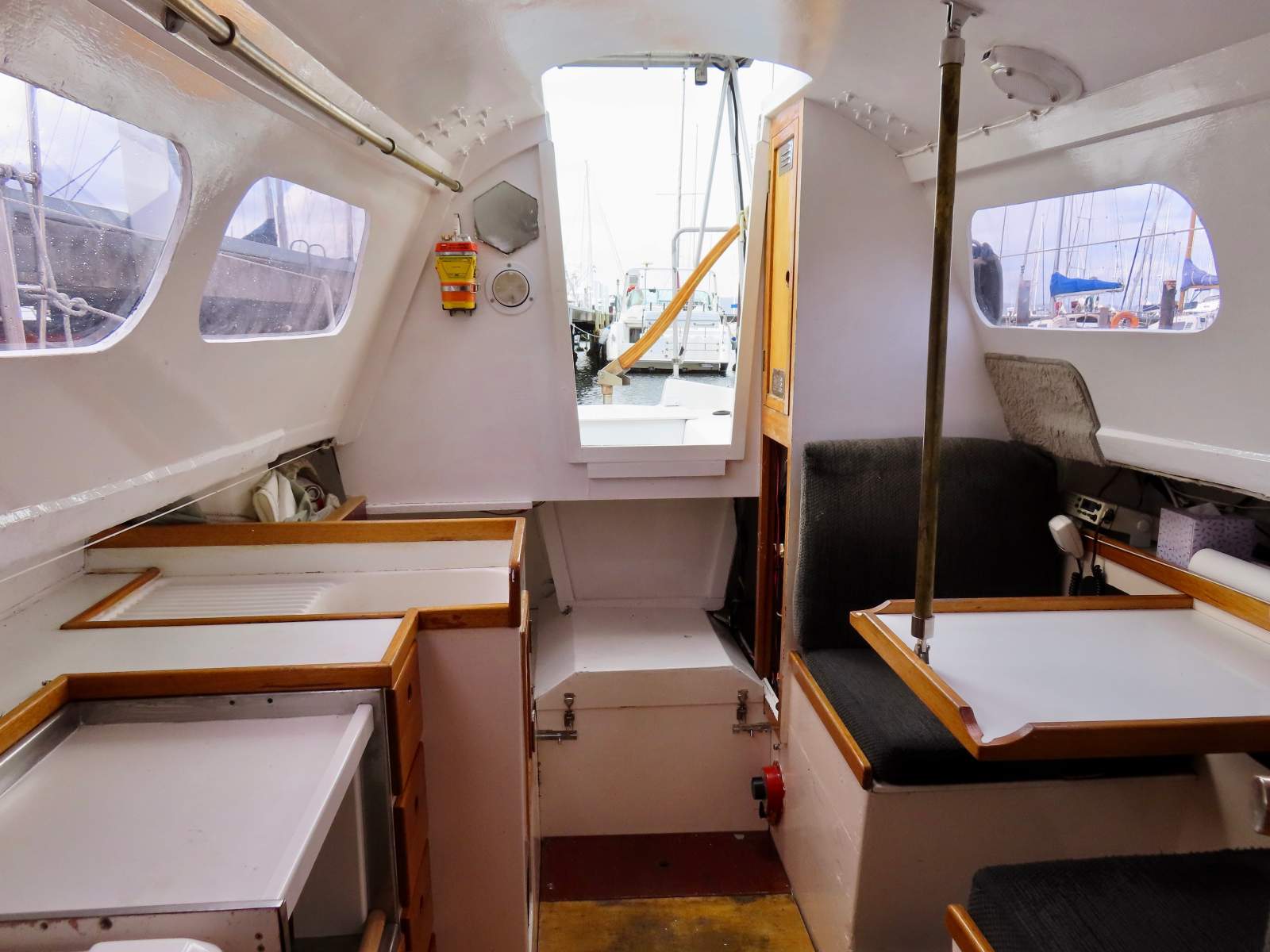 Stepping inside, the clean white finishes and quality timber trims create a light and airy ambience. The generous windows provide ample natural light and excellent visibility out. To port is the dinette with two comfortable settees. The galley runs along the starboard side and is equipped with a portable 12V Fridge, good bench space, and plenty of storage. Forwards is a generous double v-berth (requires a mattress), and there is a private bathroom with a manual marine toilet.