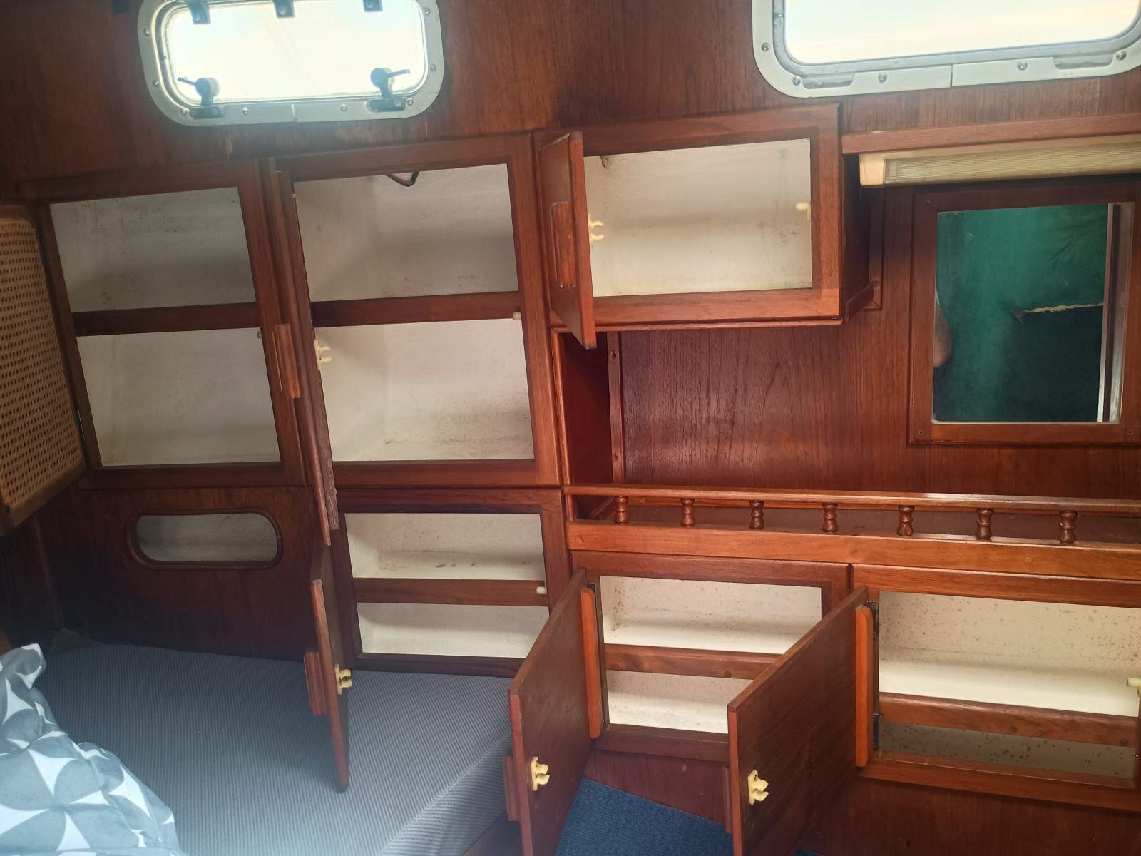 Layout - twin bunks forward with lockers and robe. Main saloon includes a spacious dining table with seating for 6 or more people plus a separate navigation table. The saloon/dining table drops down to a huge king size berth. There is a single berth opposite.