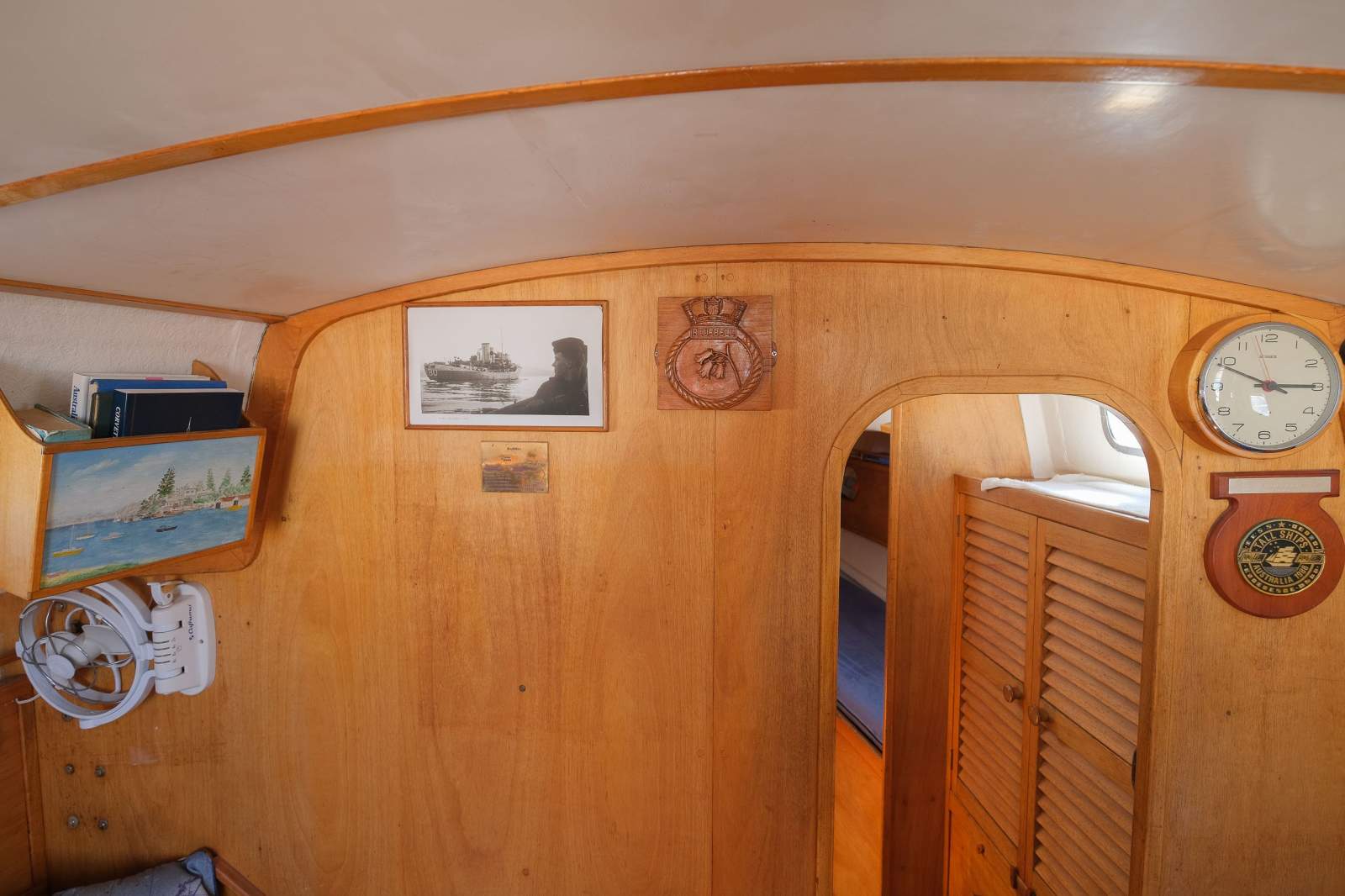 Below deck, the interior is finished in light timbers that give the cabin a bright, welcoming feel. A clever design feature is the large dining table, which folds neatly away against the bulkhead to maximise space when it's not required.