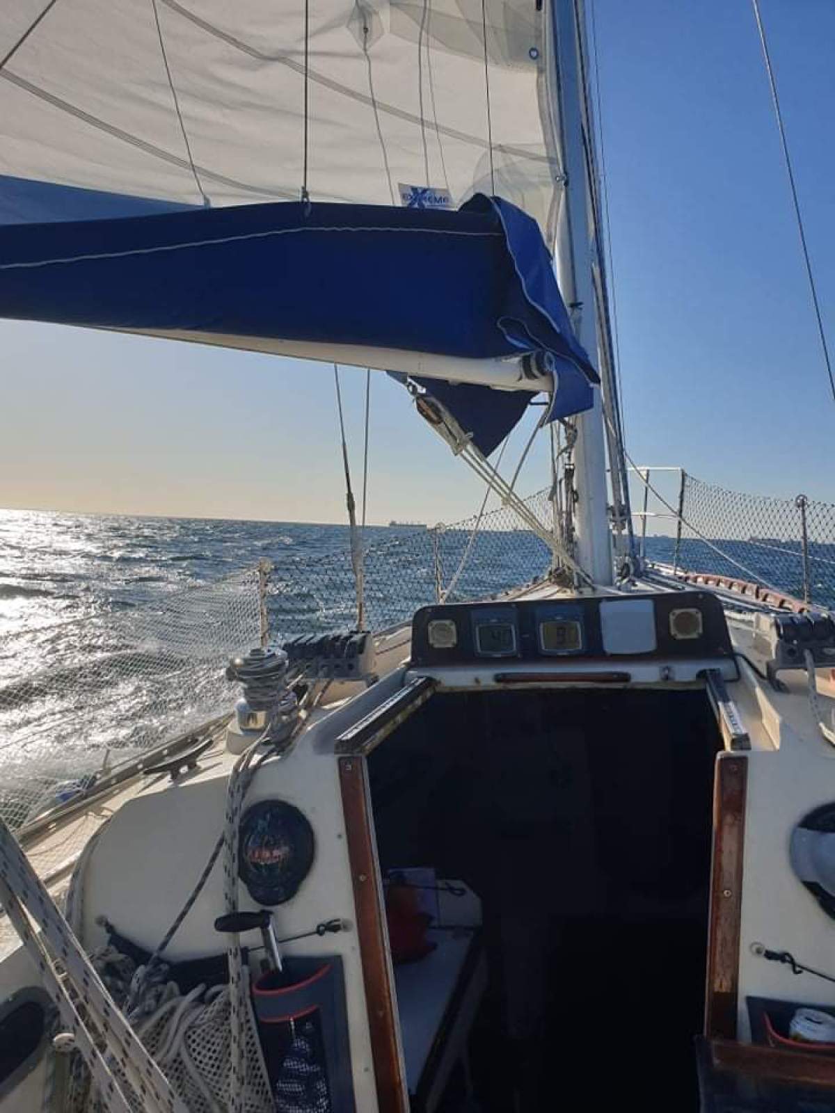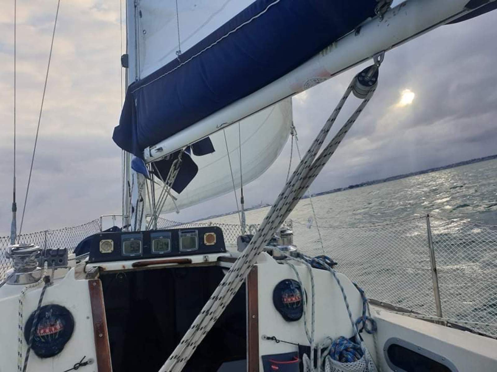 6 oversized winches (Barlow), lines run back to cockpit, seperate lines for reefing from cockpit
