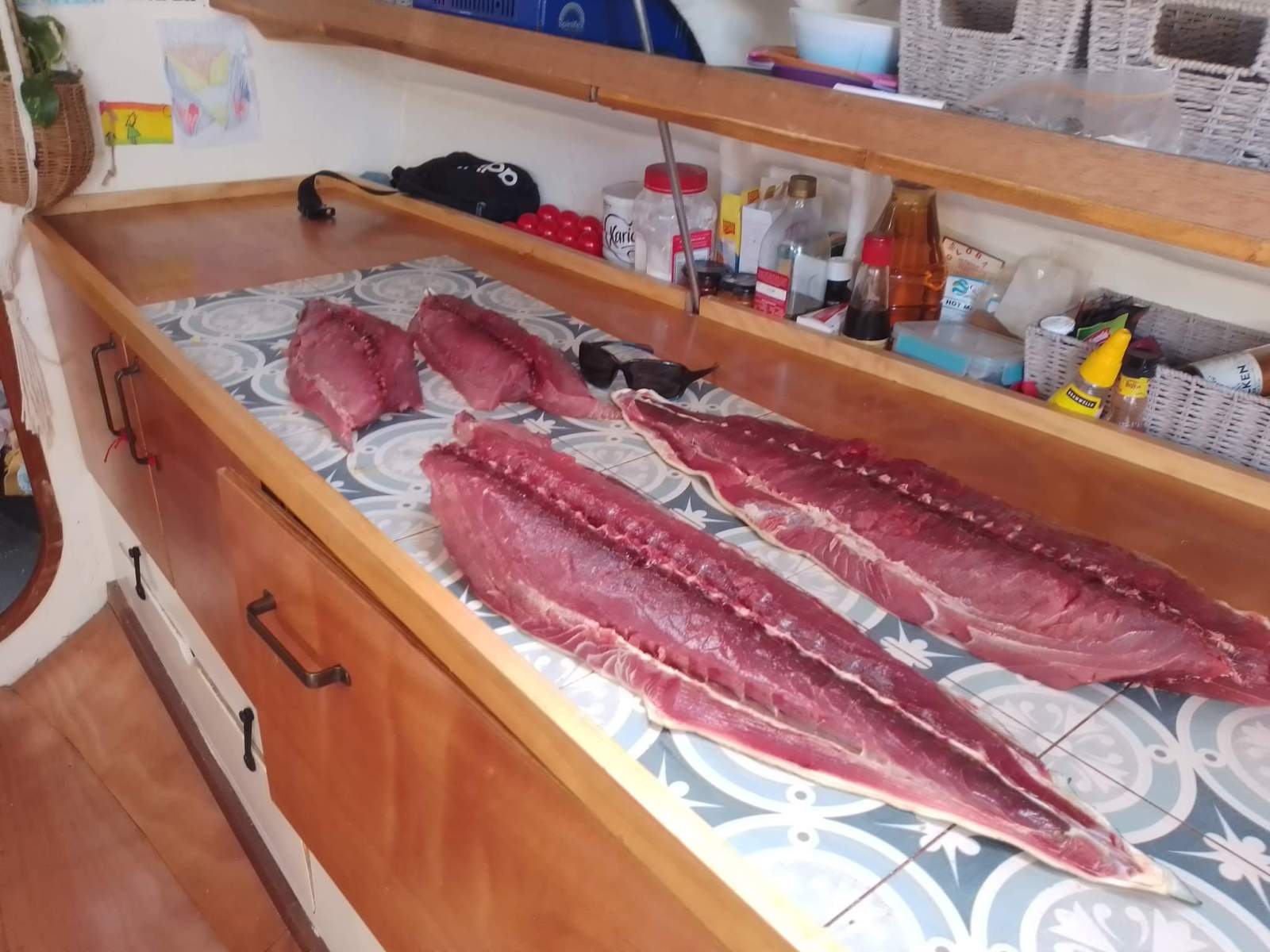 Custom built Galley runs the length of the cabin, modified for extra cooking area and food preparation